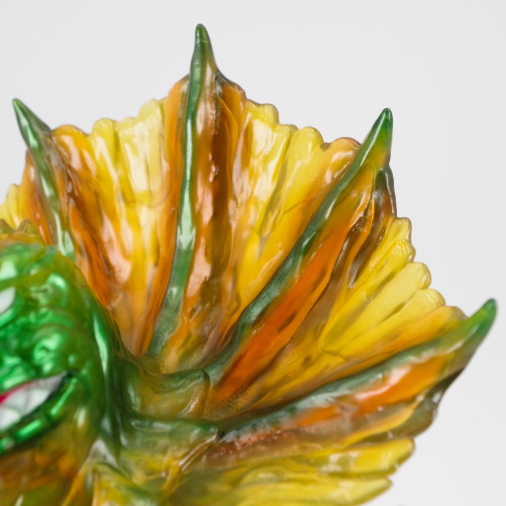 三白眼の猛々しい表情や、ボリュームたっぷりのエリ巻きと背ビレを備えたインパクト抜群の造形は必見だ。