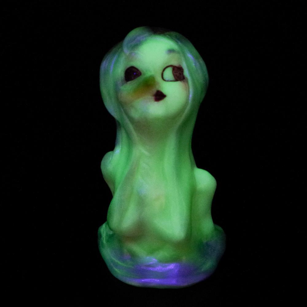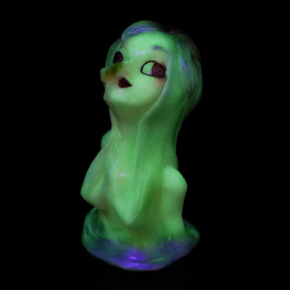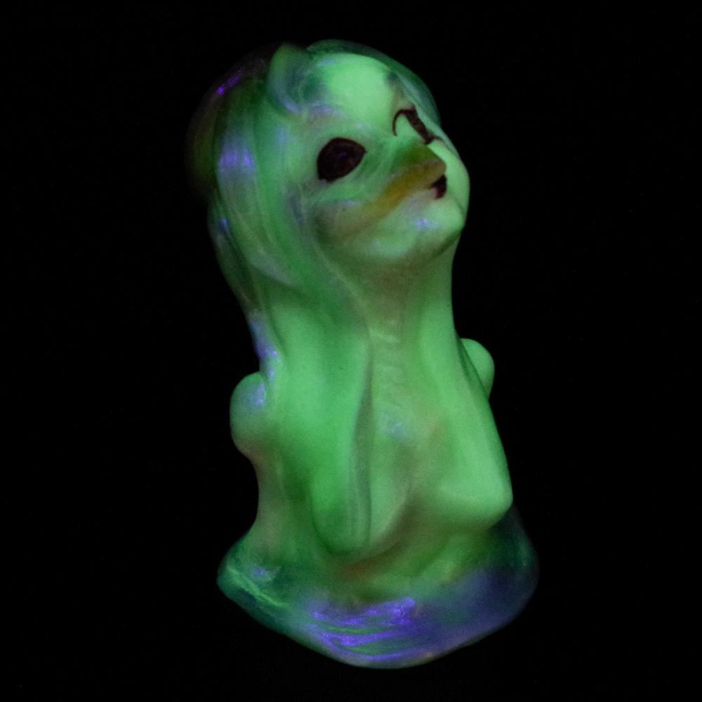 暗闇で怪しく緑色に光る蓄光成型を活かすことで、通常時と発光時の双方で異なる妖艶な雰囲気を味わうことができるのに注目してほしい。