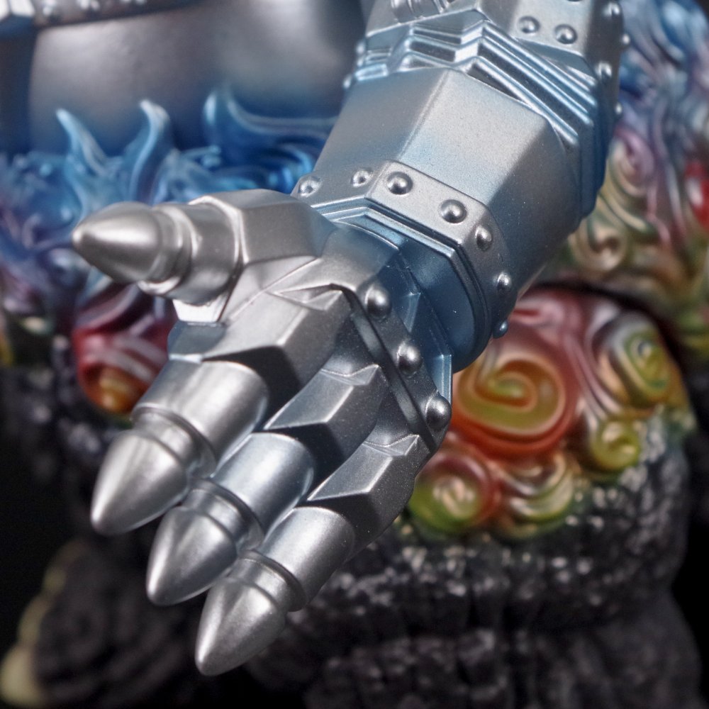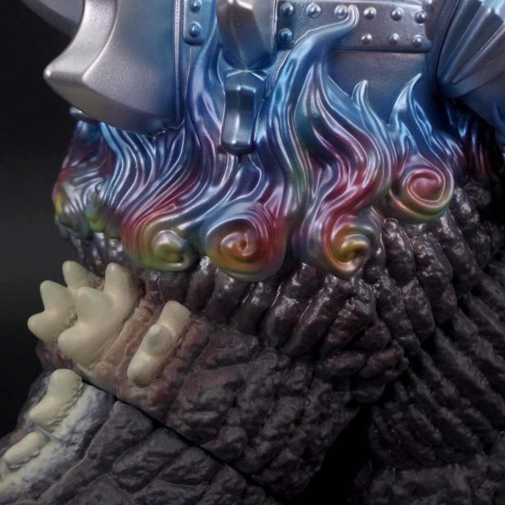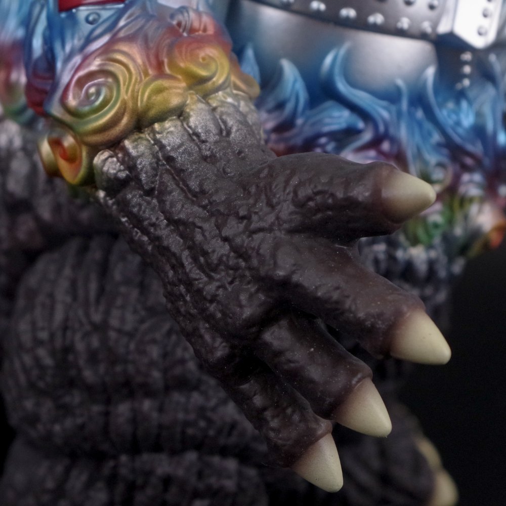 平面と曲面が混在する複雑な面構成や全身に打ち込まれたリベットといったメカゴジラらしいポイントと、下半身に残るゴジラの表皮との質感の違いを見事に表現したこだわりの一作だ。