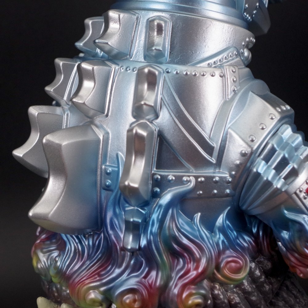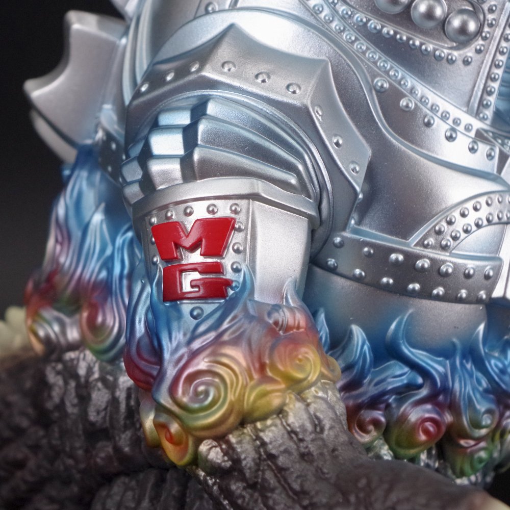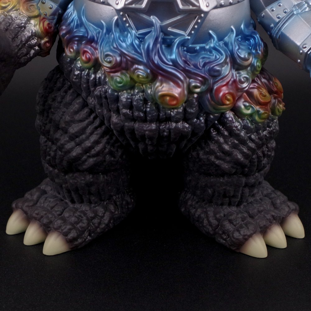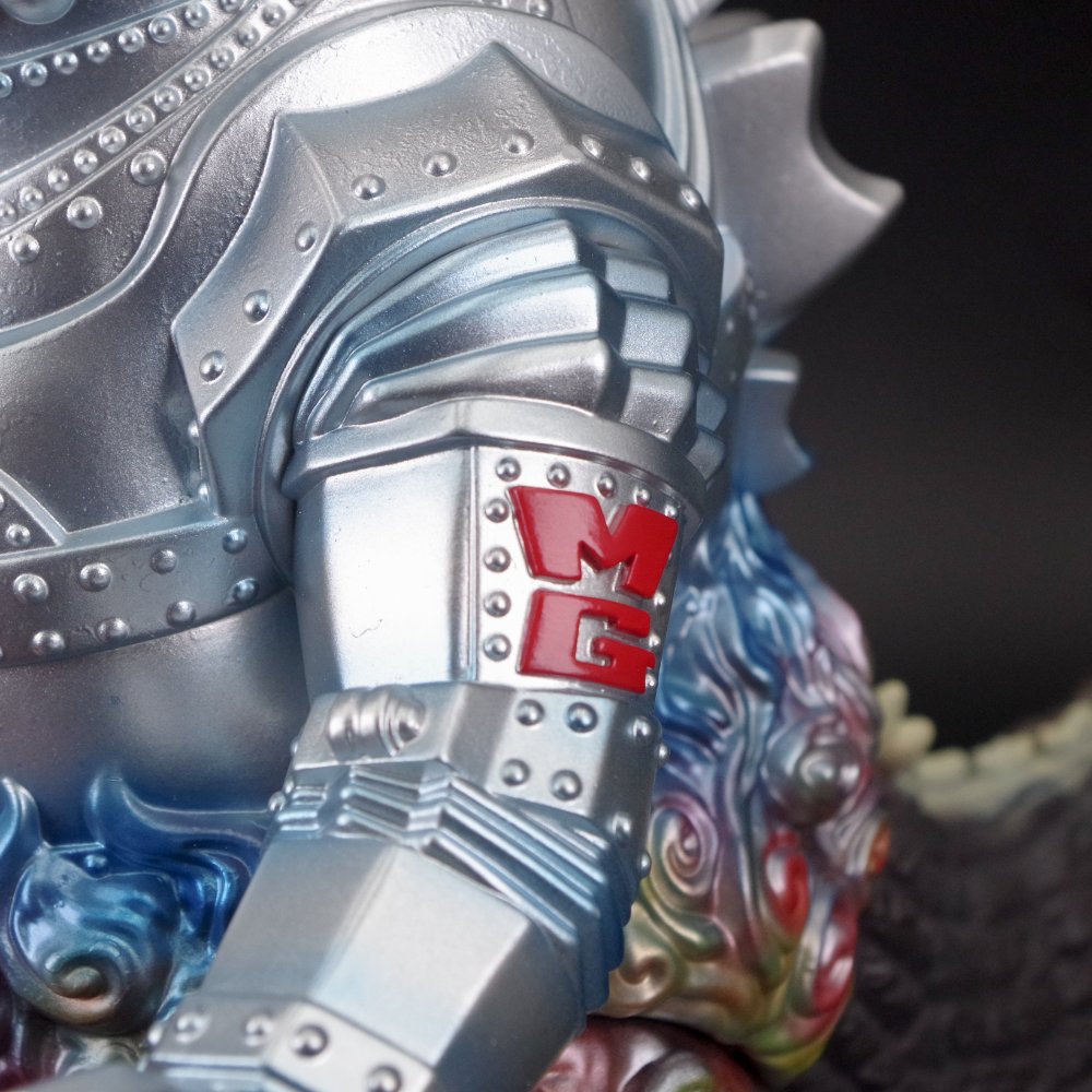 平面と曲面が混在する複雑な面構成や全身に打ち込まれたリベットといったメカゴジラらしいポイントと、下半身に残るゴジラの表皮との質感の違いを見事に表現したこだわりの一作だ。