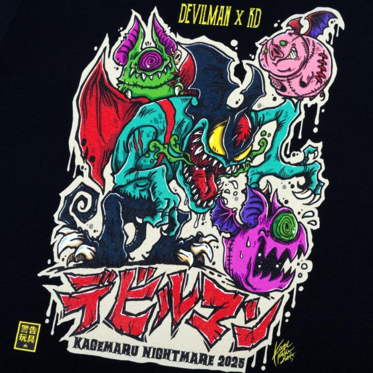 「永井豪」先生の傑作キャラクター「デビルマン」との豪華コラボレーションが実現した描き下ろしイラストを使用したTシャツは、シックなブラックのベースにKAGEMARU DESIGNSらしい鮮やかな色使いが実に映える一枚。