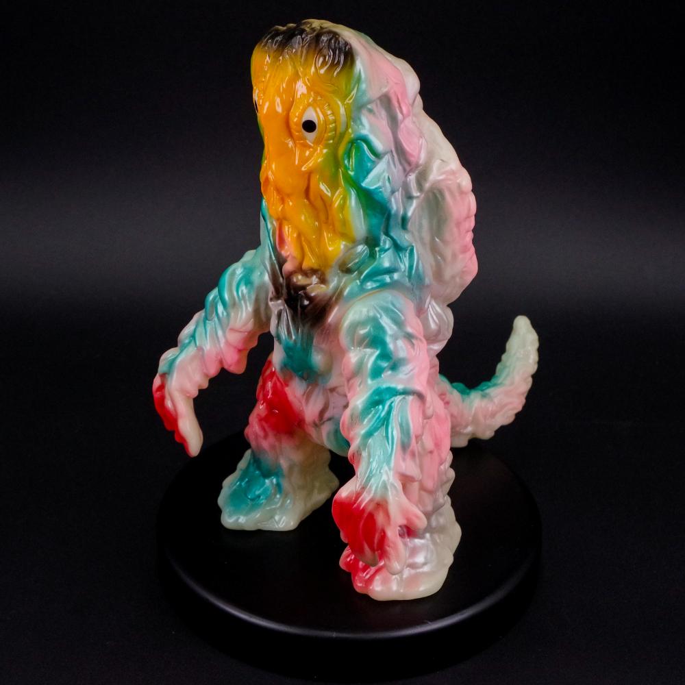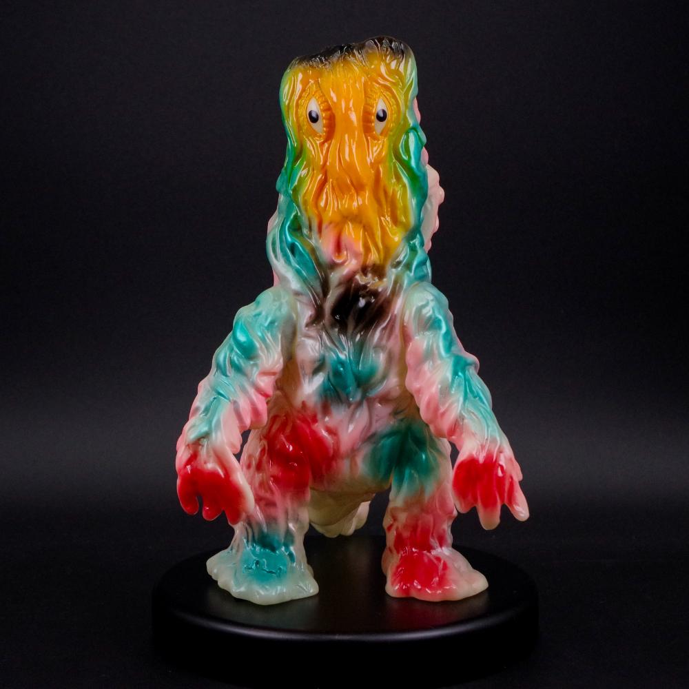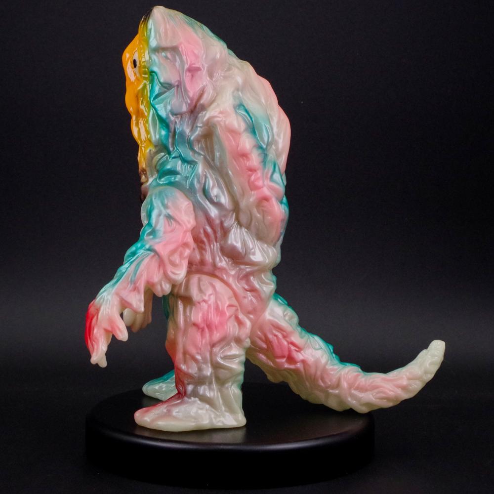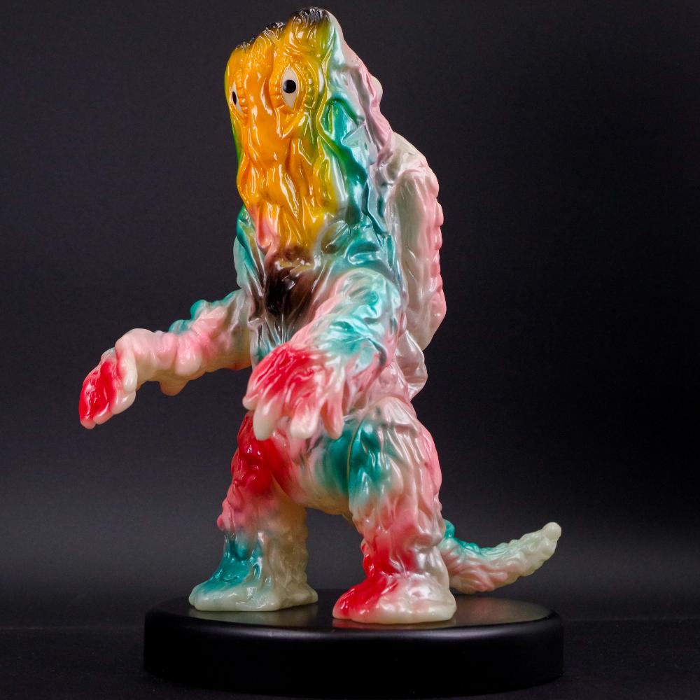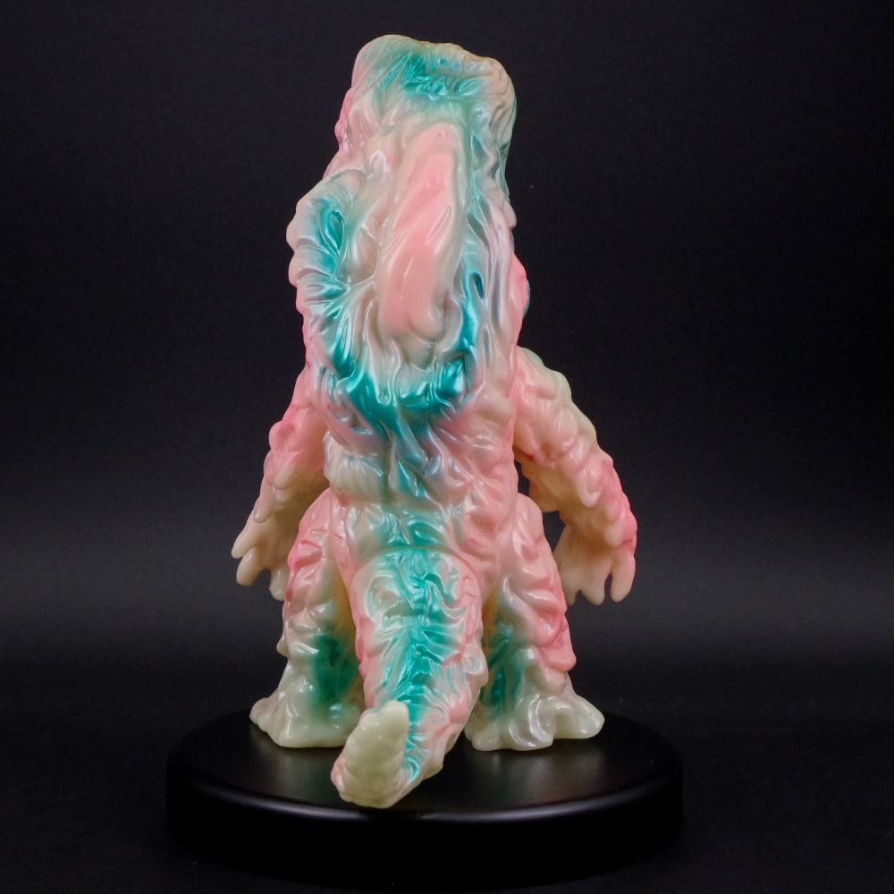 暗闇で怪しく光る蓄光成型に「ピンクヘドラ」の愛称で親しまれる海外輸出版の配色を落とし込んだ見事な仕上がりに、ブルマァク製品を知り尽くした氏ならではのこだわりを感じてほしい。