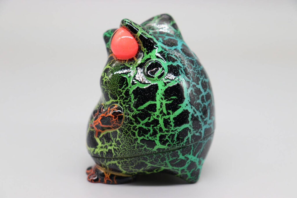 「カエル」の愛らしさと「ダルマ」のフォルムがひとつになったユーモラスなデザインがソフビ好きから支持を集める本アイテム。